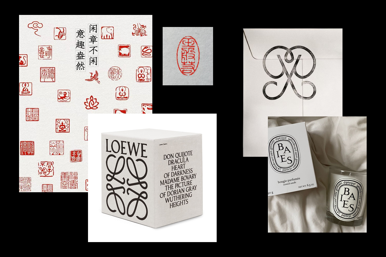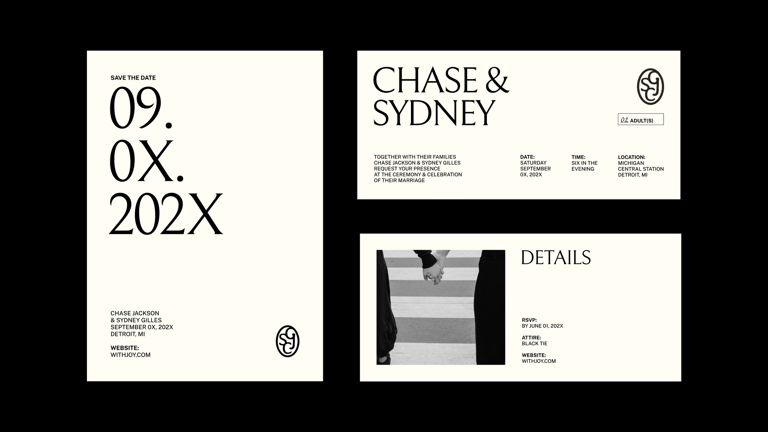 I started my design process with the monogram. I was drawn to east Asian red signature stamps and luxury brand logos. I’m typically a very structured person and I loved the idea of the monogram having a clear holding shape but organic lines inside of it. I wanted something that looked organized but still warm and hand made. I sketched and arranged our initials (SG, CJ) in so many different ways and got frustrated and let me mind roam around my bedroom. My eyes landed on a Diptyque candle that helped me get to the final design.
